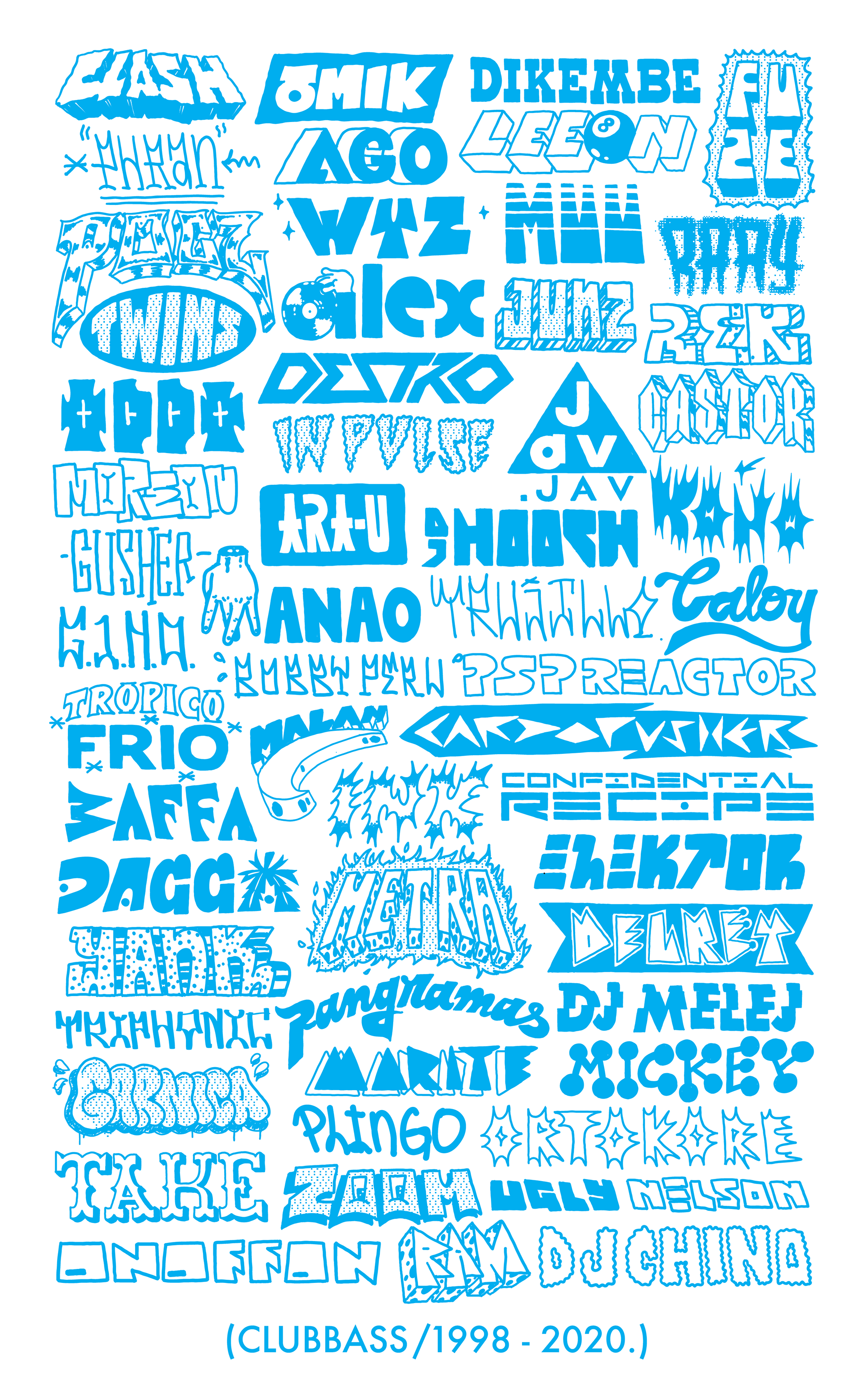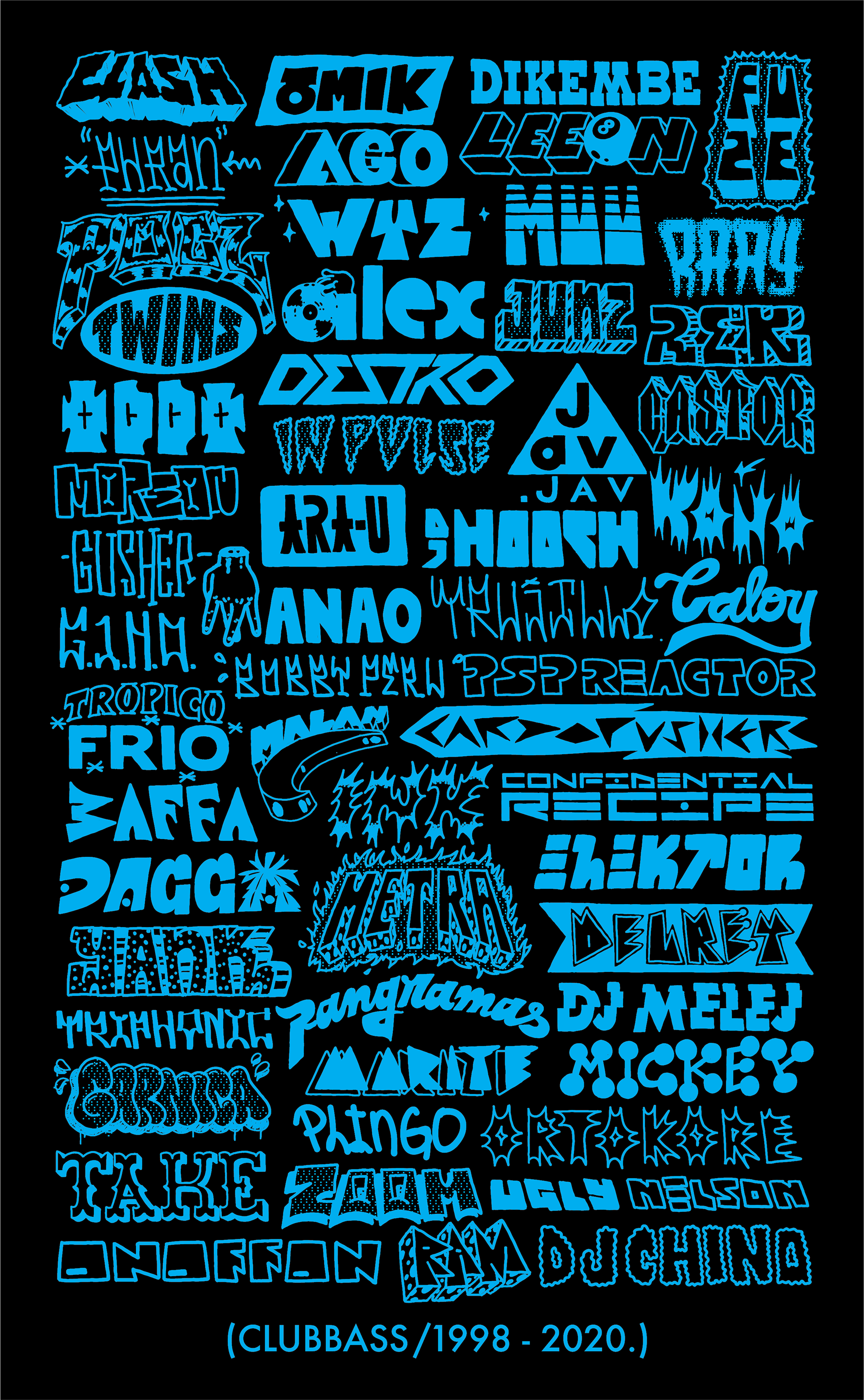 Tee Shirt Design for Club Bass. Top DJs, artists, musicians, event prodcuers. 1998 -2020 Venezuela, World Wide now.